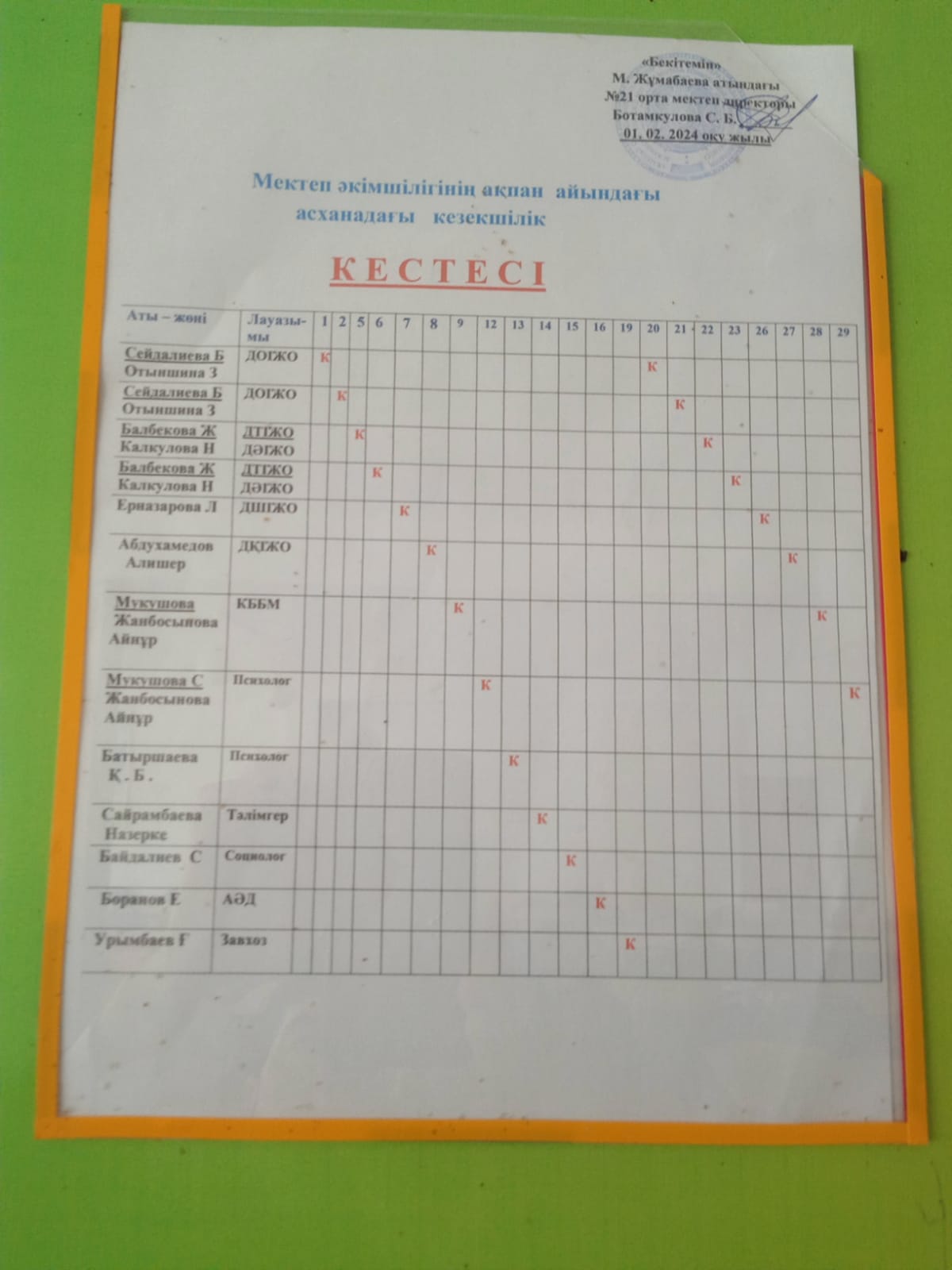 Мектеп әкімшілігінің акпан айындағы кезекшілік кестесі » Жамбыл облысы Тараз қаласы білім бөлімінің "Мағжан Жұмабаев атындағы № 21 орта мектеп" коммуналдық мемлекеттік мекемесі