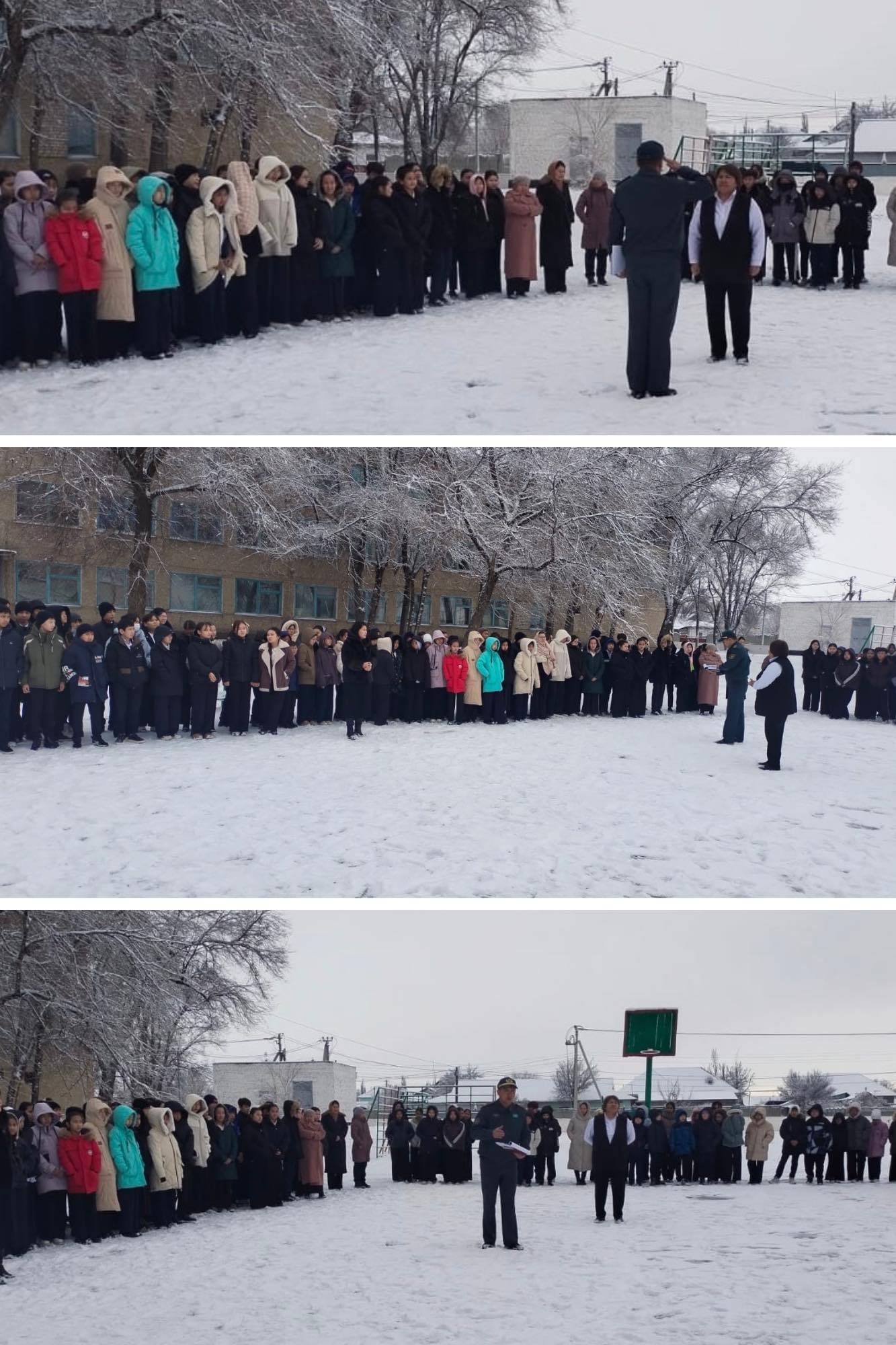 Іс-шара барысында ұжым мүшелері мен түскі ауысымдағы барлық сынып білім алушылары толық қатысып, төтенше жағдайлар кезіндегі қауіпсіздік ережелері түсіндіріліп, практикалық түрде көрсетілді.