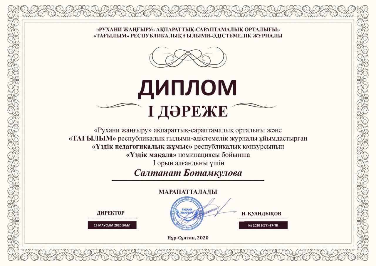 I дәрежелі диплом "Үздік мақала" » Жамбыл облысы Тараз қаласы білім бөлімінің "Мағжан Жұмабаев атындағы № 21 орта мектеп" коммуналдық мемлекеттік мекемесі