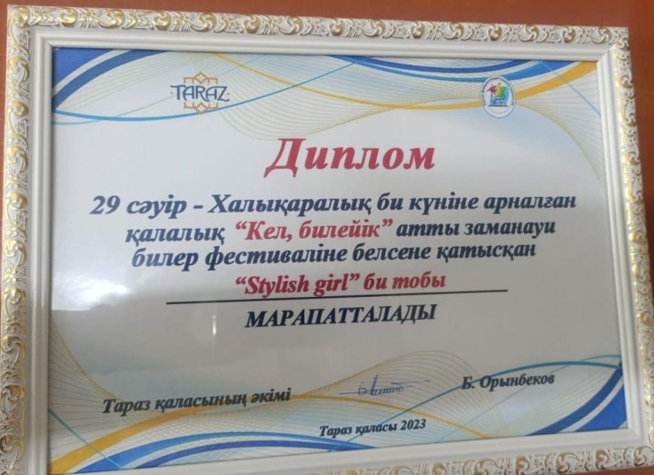 Қалалық "Кел, билейік" билер фестивалінен 6 а,ә,б,в сыныптары арасынан 10 оқушы әкімнің дипломын алып келді. Жетекшісі: Назарбекова Динара, Толымбекова Дина. Еңбектеріңіз жана берсін!
