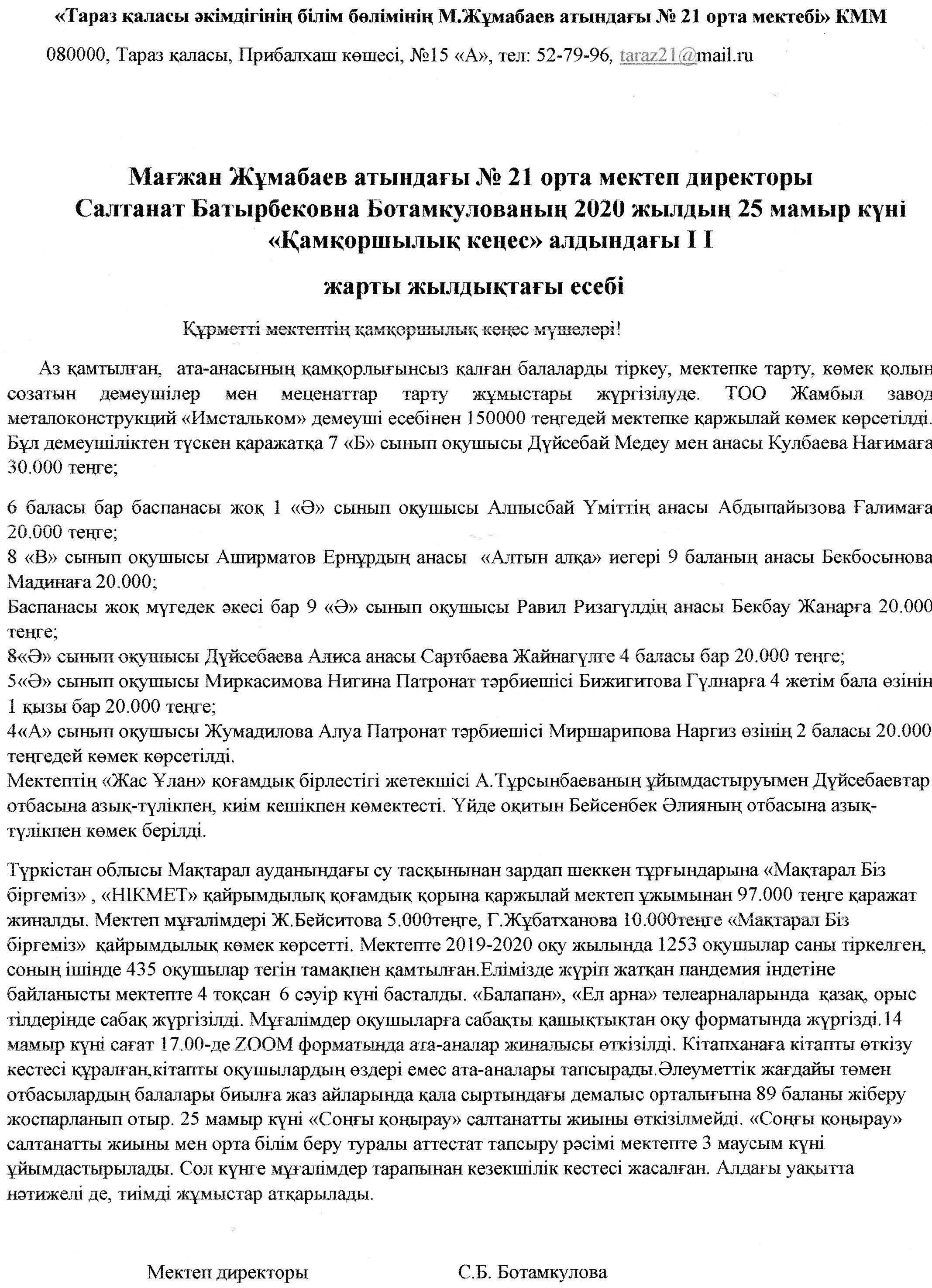 М.Жұмабаев атындағы №21 орта мектеп директоры С.Б.Ботамкулованың 2020 жылдың 25 мамыр күні "Қамқоршылық кеңес" алдындағы ІІ жарты жылдықтағы есебі » Жамбыл облысы Тараз қаласы білім бөлімінің "Мағжан Жұмабаев атындағы № 21 орта мектеп" коммуналдық мемлекеттік мекемесі