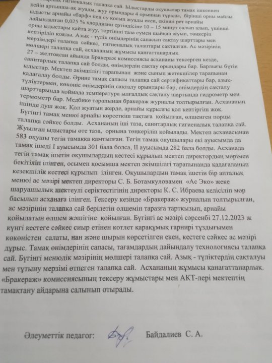 Бракераж комиссиясының 2 тоқсандағы тексеру қорытындысының аныктамасы » Жамбыл облысы Тараз қаласы білім бөлімінің "Мағжан Жұмабаев атындағы № 21 орта мектеп" коммуналдық мемлекеттік мекемесі