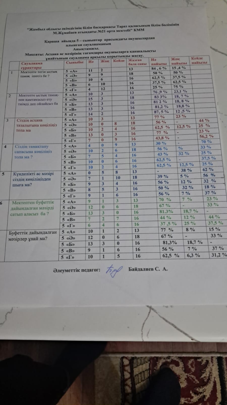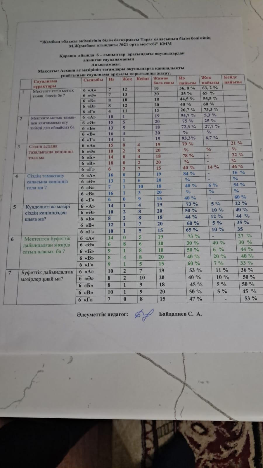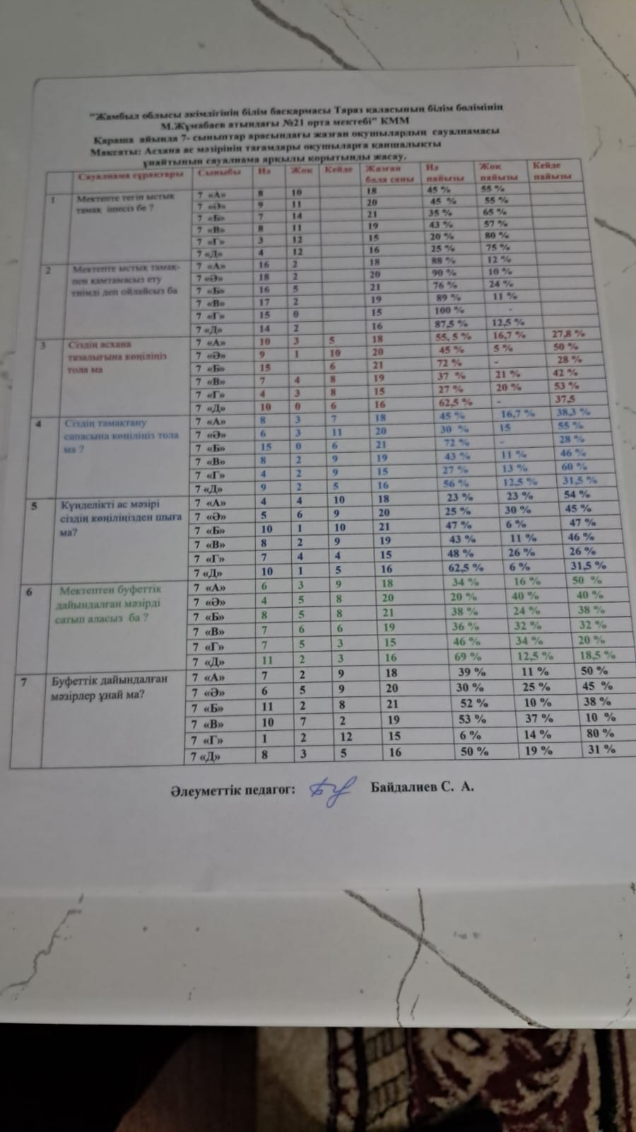 Асхана ас мәзірінің сауалнамасының қорытындысы » Жамбыл облысы Тараз қаласы білім бөлімінің "Мағжан Жұмабаев атындағы № 21 орта мектеп" коммуналдық мемлекеттік мекемесі