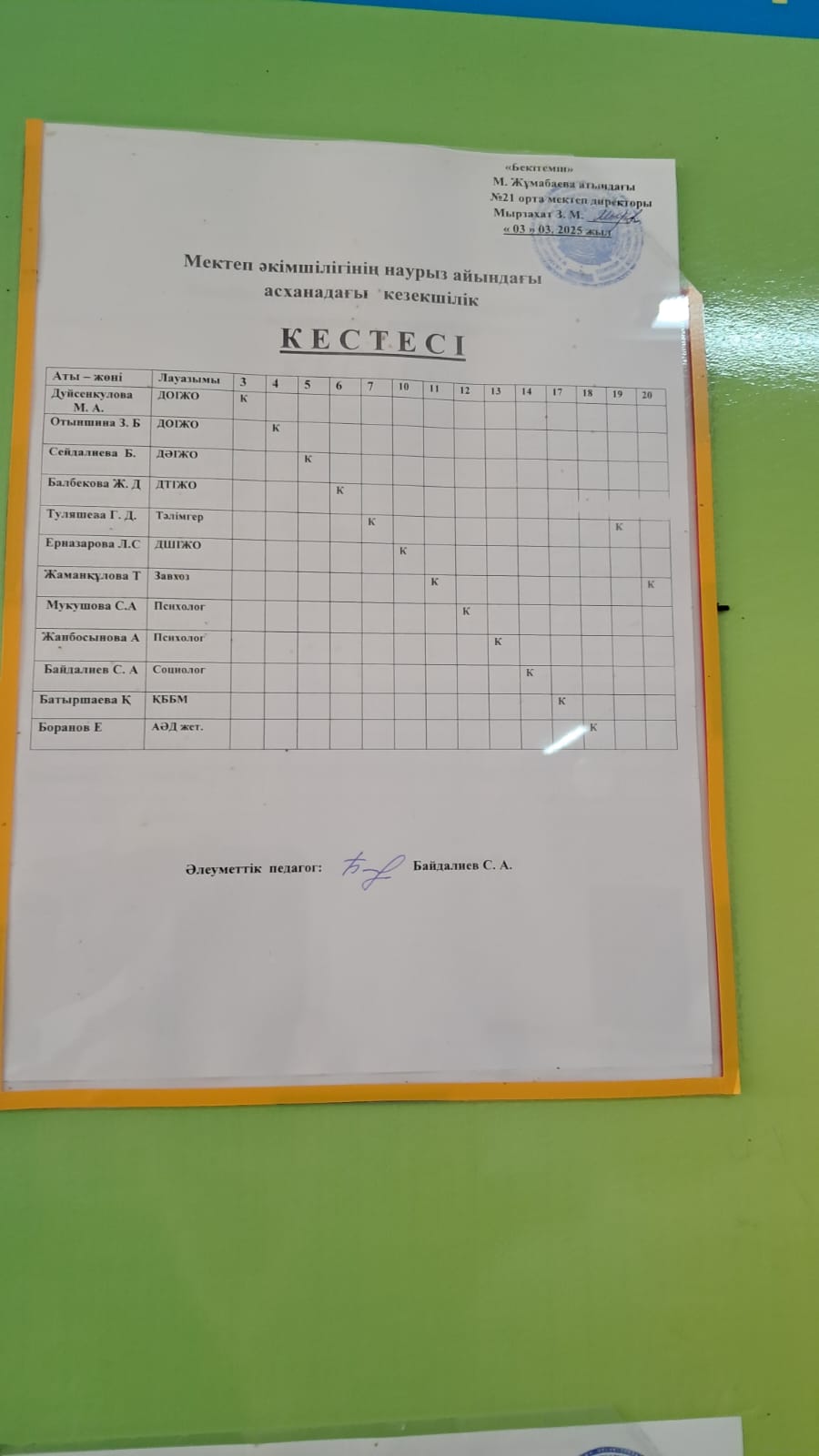 Асханадағы кезекшілік кестесі » Жамбыл облысы Тараз қаласы білім бөлімінің "Мағжан Жұмабаев атындағы № 21 орта мектеп" коммуналдық мемлекеттік мекемесі