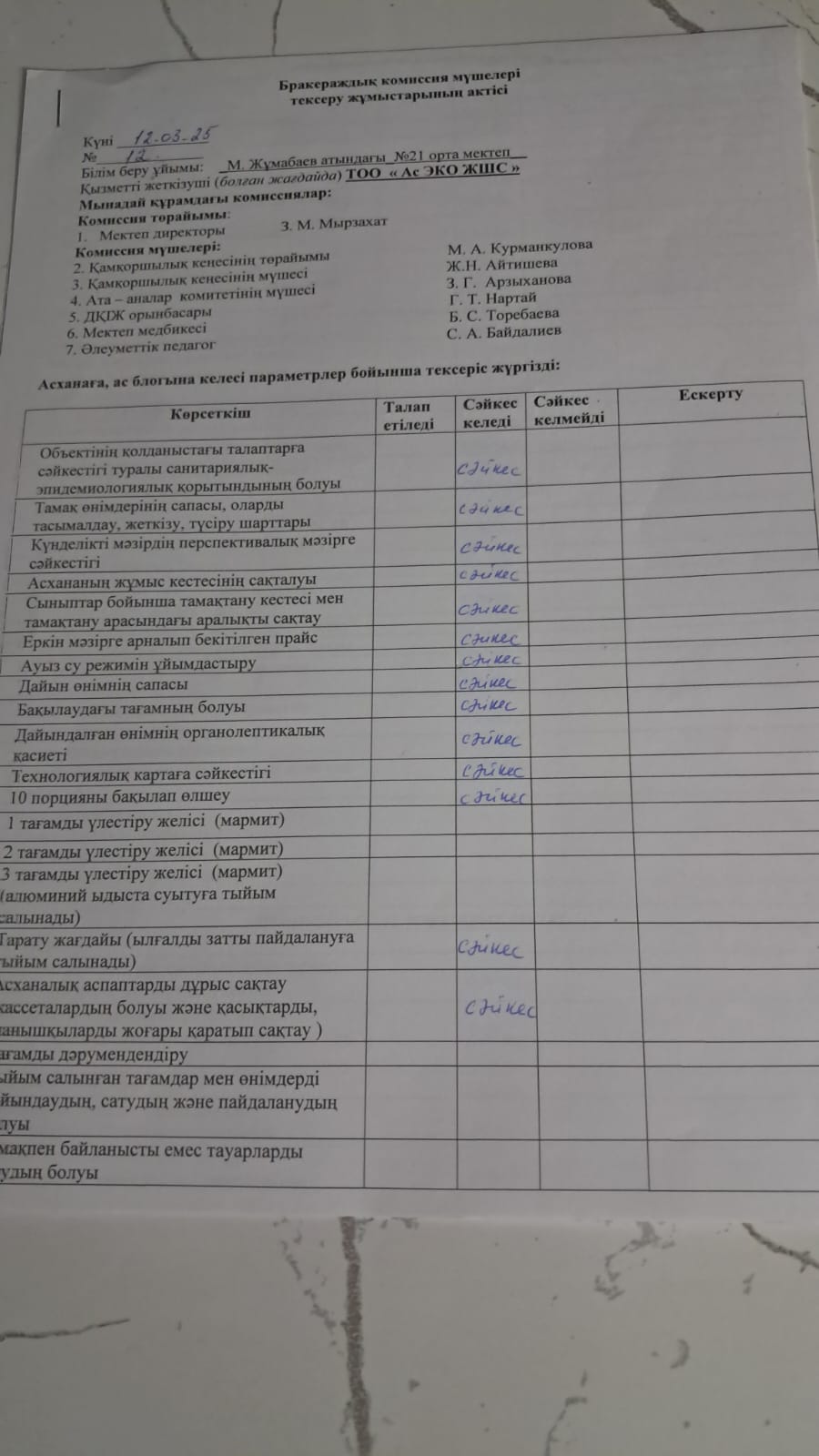 Бракераж комиссиясының асхананы тексеру актісі » Жамбыл облысы Тараз қаласы білім бөлімінің "Мағжан Жұмабаев атындағы № 21 орта мектеп" коммуналдық мемлекеттік мекемесі