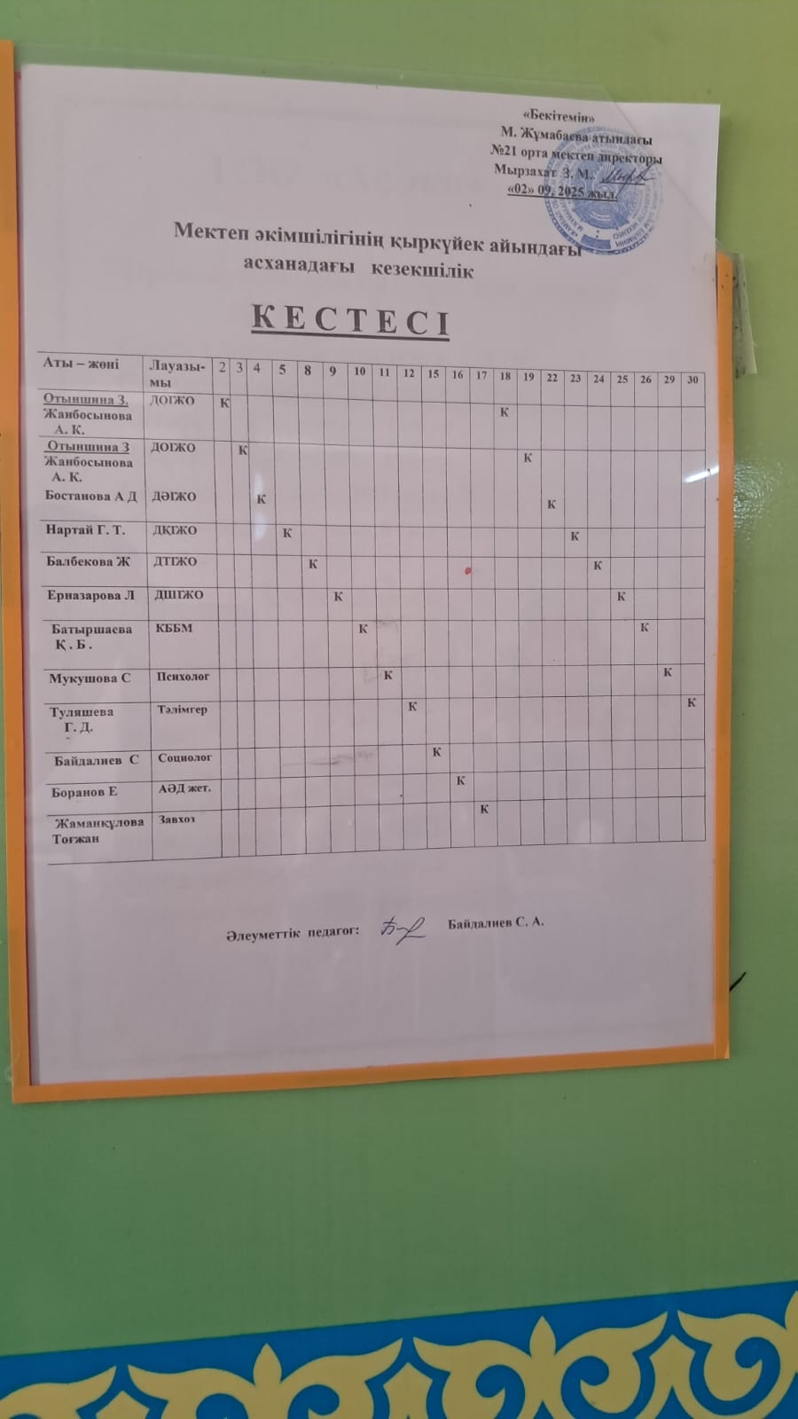Мектеп әкімшілігінің асханадағы кестесі » Жамбыл облысы Тараз қаласы білім бөлімінің "Мағжан Жұмабаев атындағы № 21 орта мектеп" коммуналдық мемлекеттік мекемесі