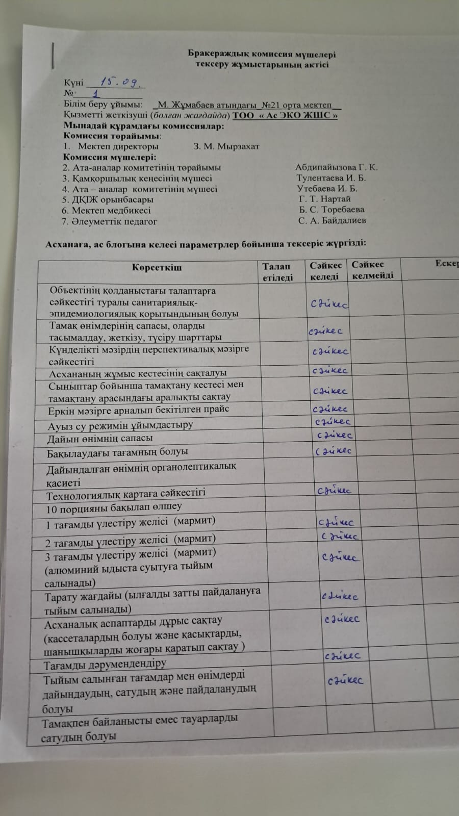 Бракераж комиссиясының тексеру жұмыстарының АКТ-cі » Жамбыл облысы Тараз қаласы білім бөлімінің "Мағжан Жұмабаев атындағы № 21 орта мектеп" коммуналдық мемлекеттік мекемесі