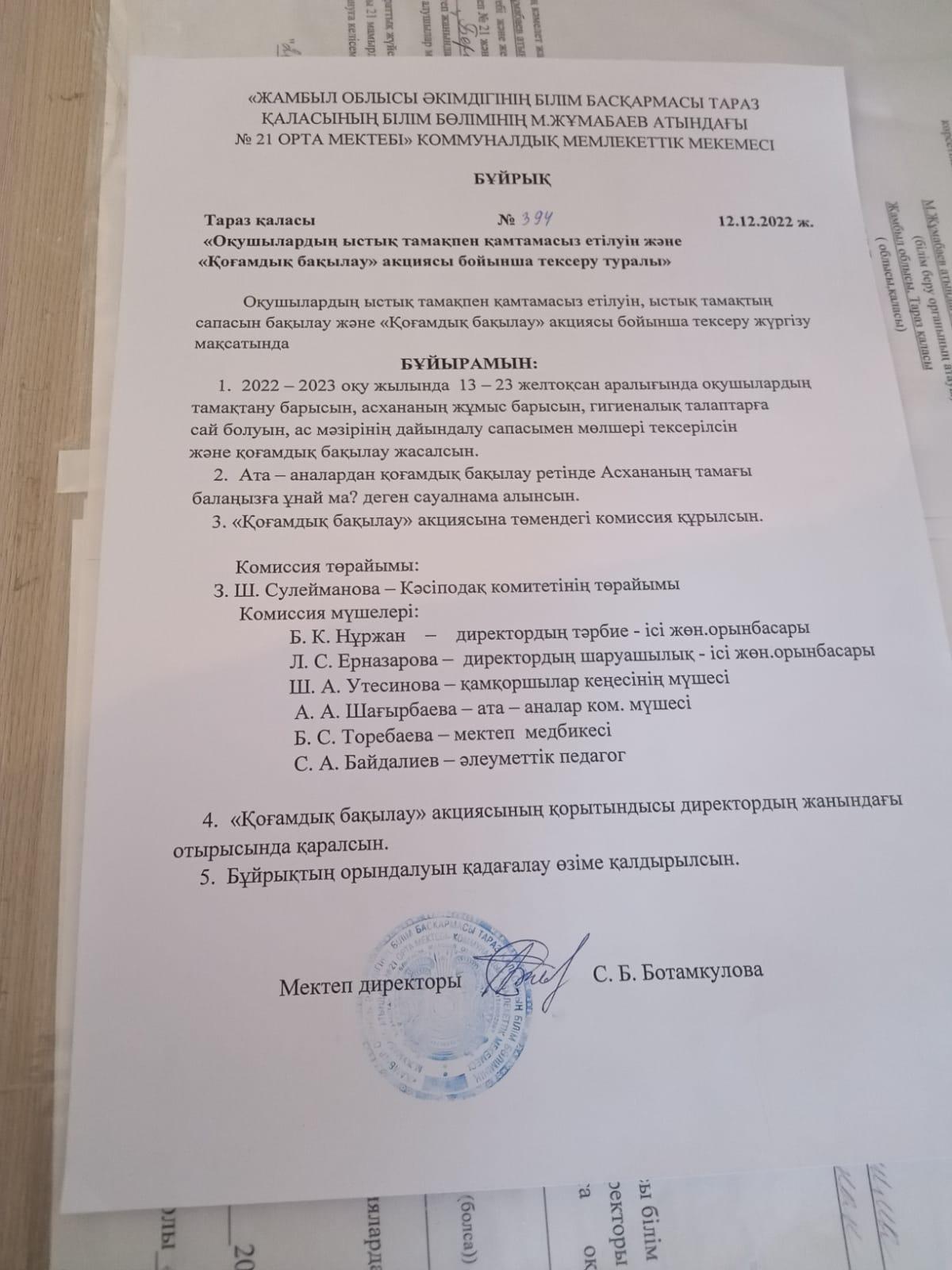 Қоғамдық бақылау акциясының бұйрығы » Жамбыл облысы Тараз қаласы білім бөлімінің "Мағжан Жұмабаев атындағы № 21 орта мектеп" коммуналдық мемлекеттік мекемесі