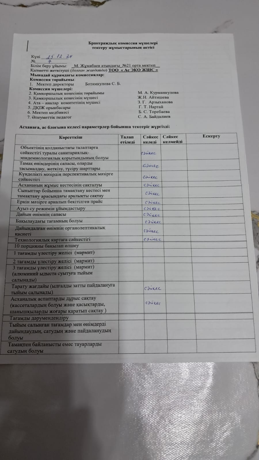 Бракераж комиссиясының АКТсі » Жамбыл облысы Тараз қаласы білім бөлімінің "Мағжан Жұмабаев атындағы № 21 орта мектеп" коммуналдық мемлекеттік мекемесі