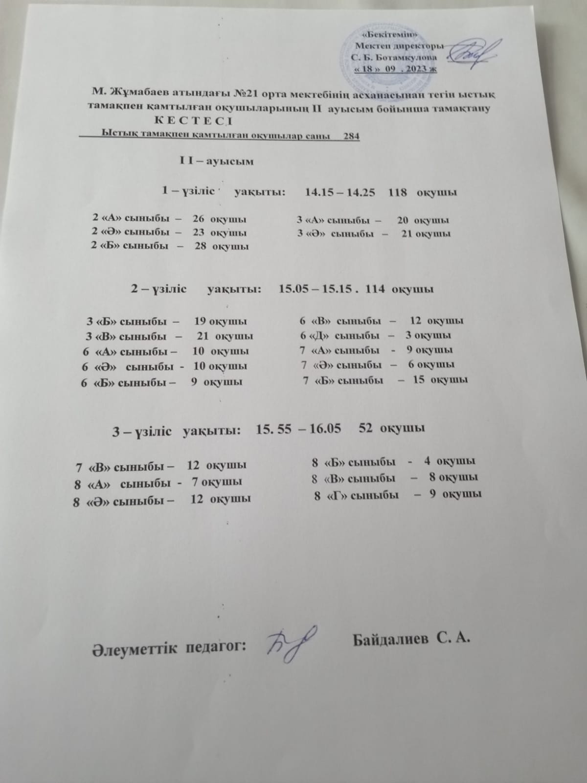 Асханаға І,ІІ ауысым кіру кестесі » Жамбыл облысы Тараз қаласы білім бөлімінің "Мағжан Жұмабаев атындағы № 21 орта мектеп" коммуналдық мемлекеттік мекемесі