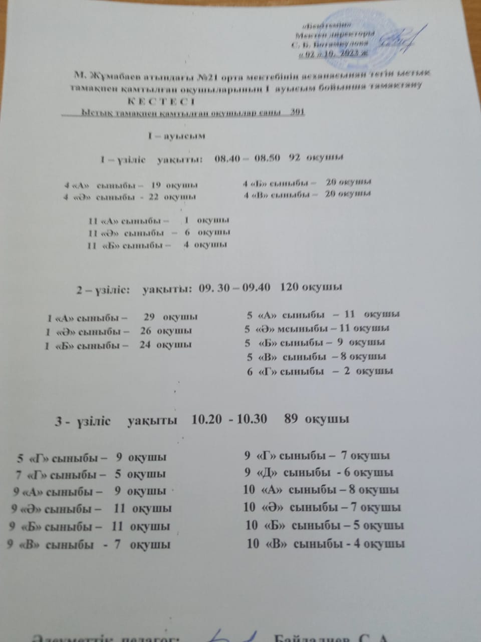 Асханаға кіру кестесі 1 ауысым » Жамбыл облысы Тараз қаласы білім бөлімінің "Мағжан Жұмабаев атындағы № 21 орта мектеп" коммуналдық мемлекеттік мекемесі