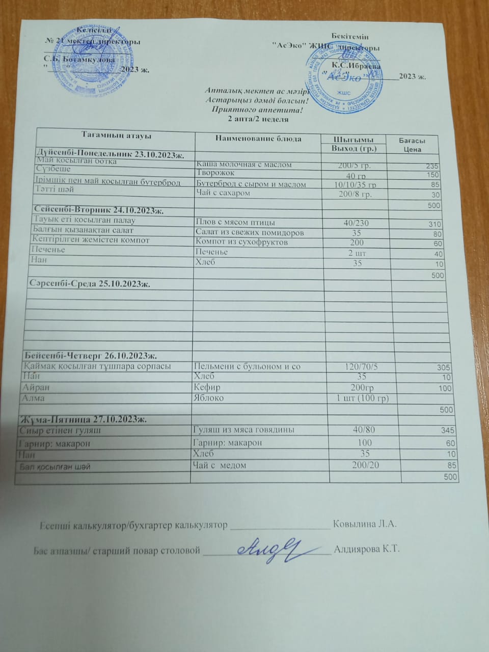 Асхананың ас мәзірінің 1 апталық кестесі » Жамбыл облысы Тараз қаласы білім бөлімінің "Мағжан Жұмабаев атындағы № 21 орта мектеп" коммуналдық мемлекеттік мекемесі