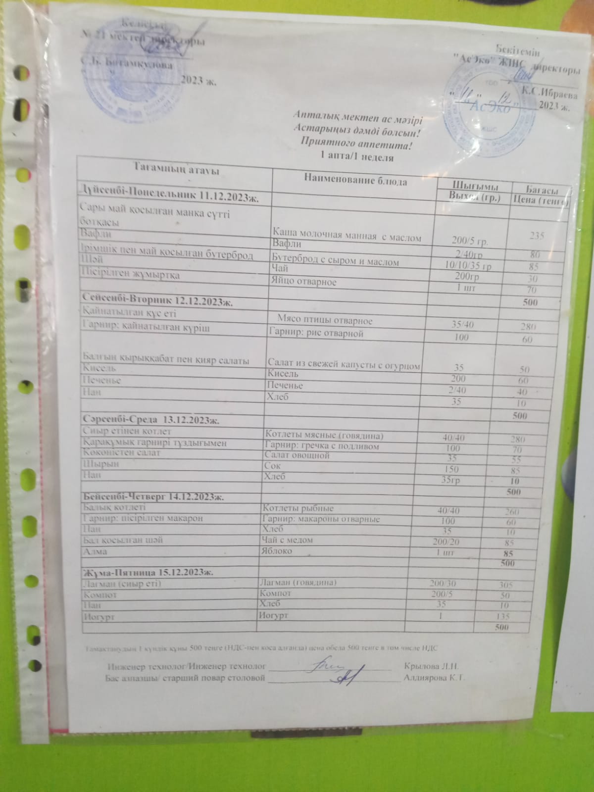 Асхананың апталық ас мәзірінің кестесі » Жамбыл облысы Тараз қаласы білім бөлімінің "Мағжан Жұмабаев атындағы № 21 орта мектеп" коммуналдық мемлекеттік мекемесі
