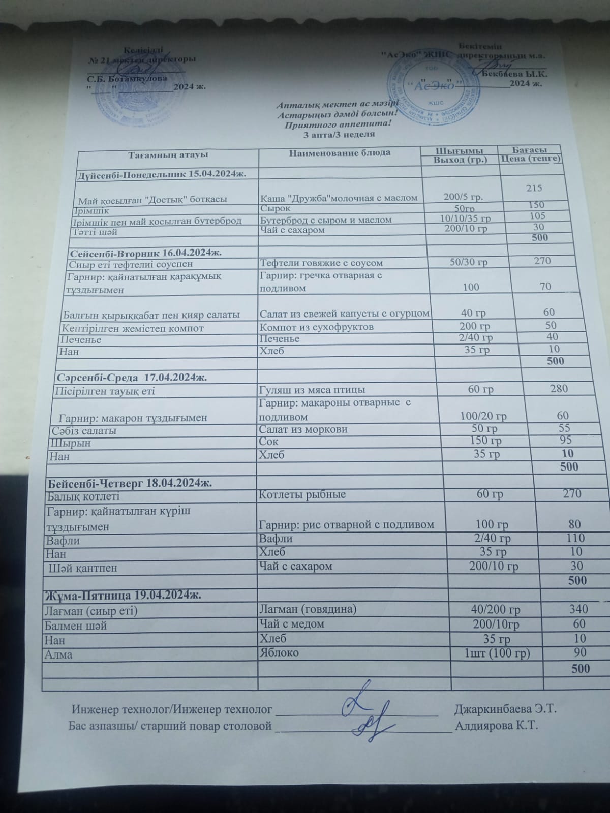 Асхананың апталык ас мәзірі » Жамбыл облысы Тараз қаласы білім бөлімінің "Мағжан Жұмабаев атындағы № 21 орта мектеп" коммуналдық мемлекеттік мекемесі