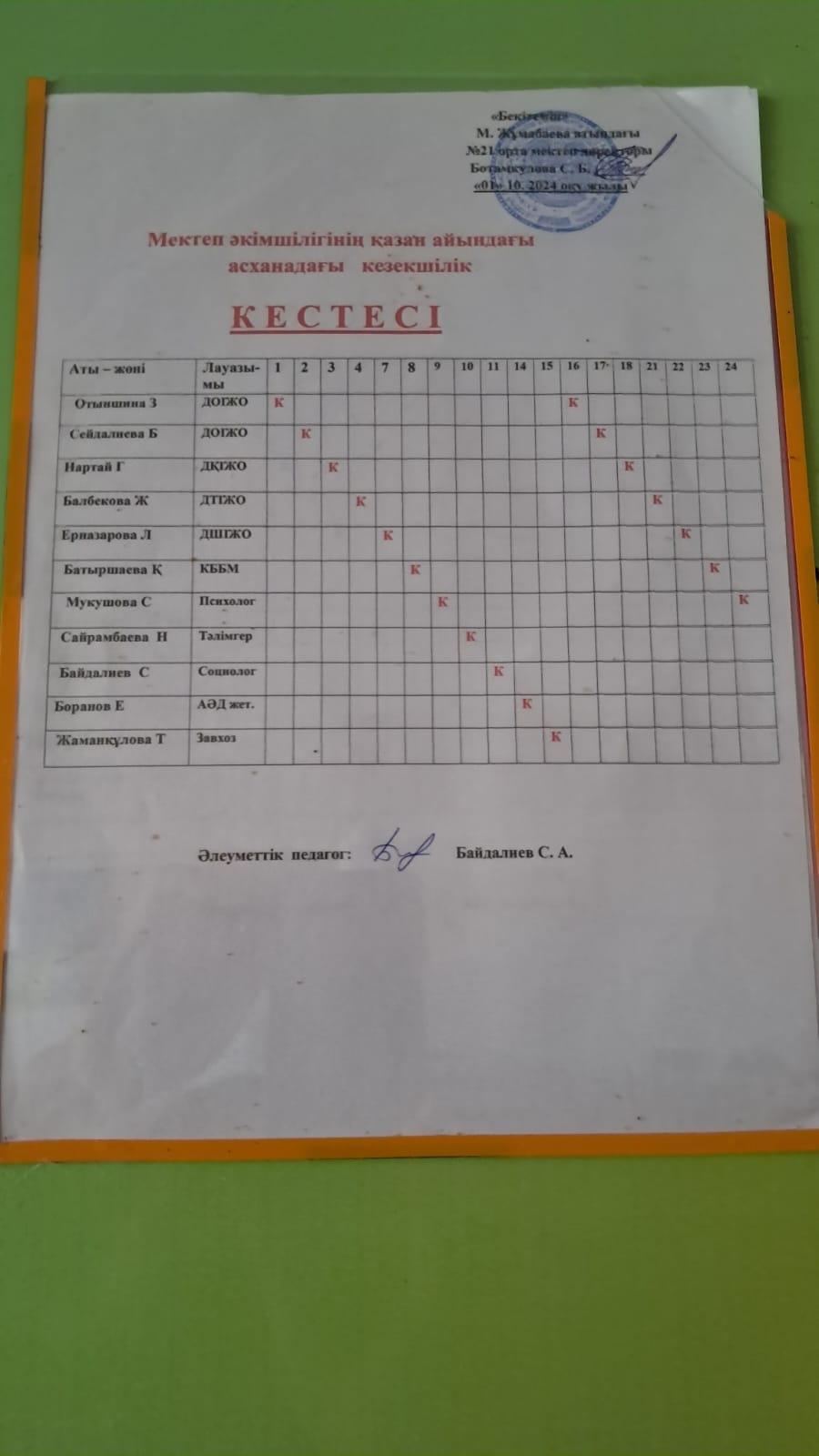 Асханадағы әкімшіліктің кезекшілік кезегі » Жамбыл облысы Тараз қаласы білім бөлімінің "Мағжан Жұмабаев атындағы № 21 орта мектеп" коммуналдық мемлекеттік мекемесі
