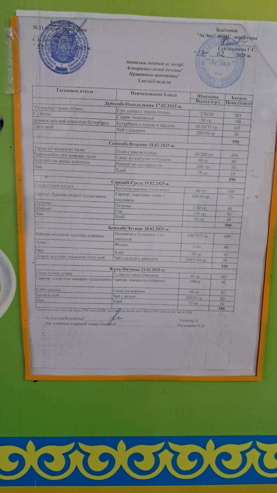 Апталық ас мәзірі » Жамбыл облысы Тараз қаласы білім бөлімінің "Мағжан Жұмабаев атындағы № 21 орта мектеп" коммуналдық мемлекеттік мекемесі