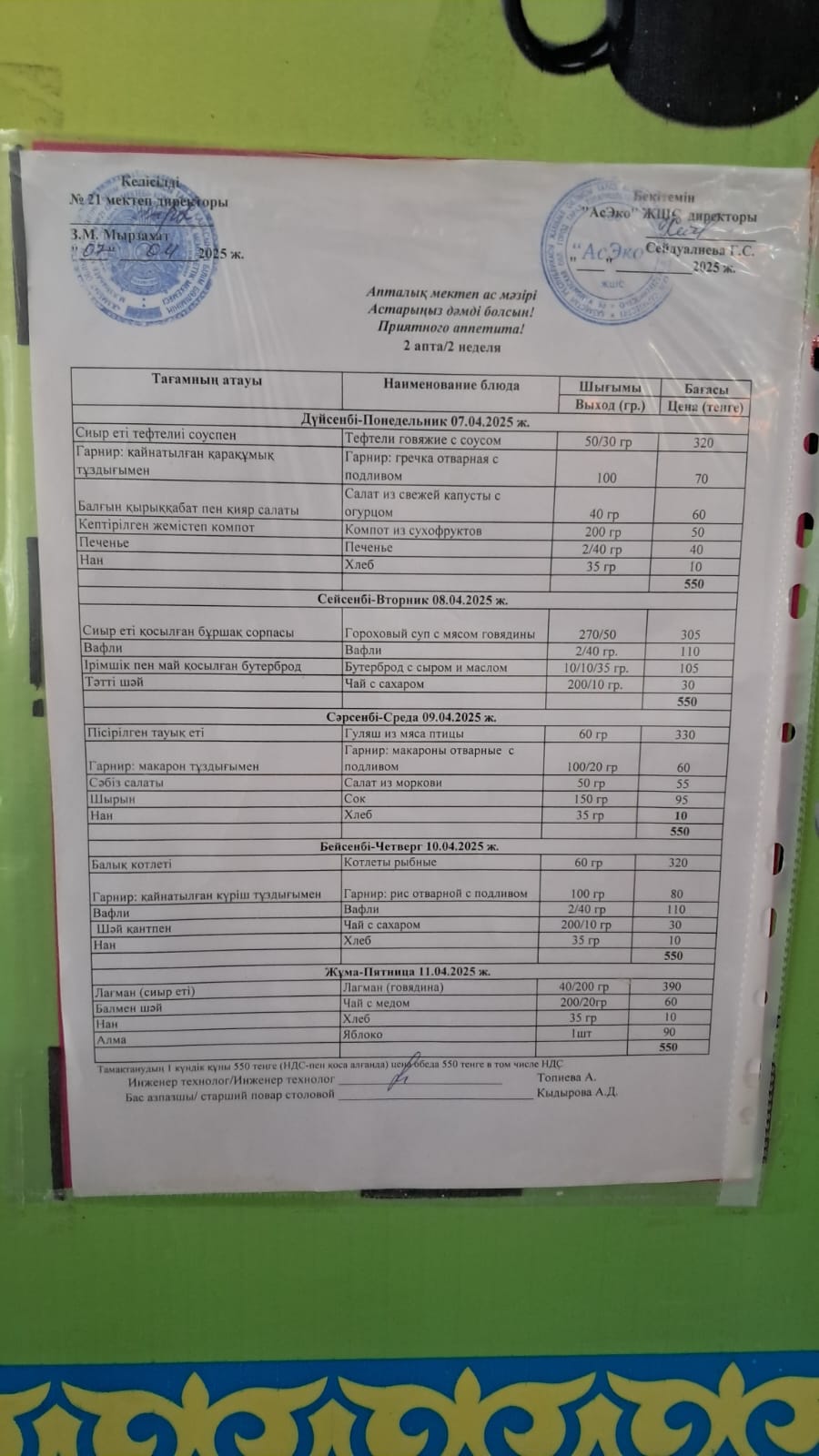 Апталық ас мәзірі » Жамбыл облысы Тараз қаласы білім бөлімінің "Мағжан Жұмабаев атындағы № 21 орта мектеп" коммуналдық мемлекеттік мекемесі