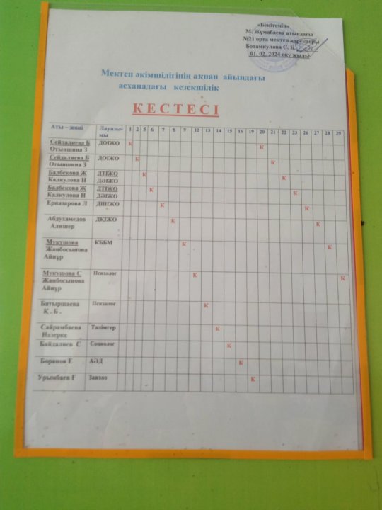 Мектеп әкімшілігінің акпан айындағы кезекшілік кестесі » Жамбыл облысы Тараз қаласы білім бөлімінің "Мағжан Жұмабаев атындағы № 21 орта мектеп" управления образования акимата Жамбылской области